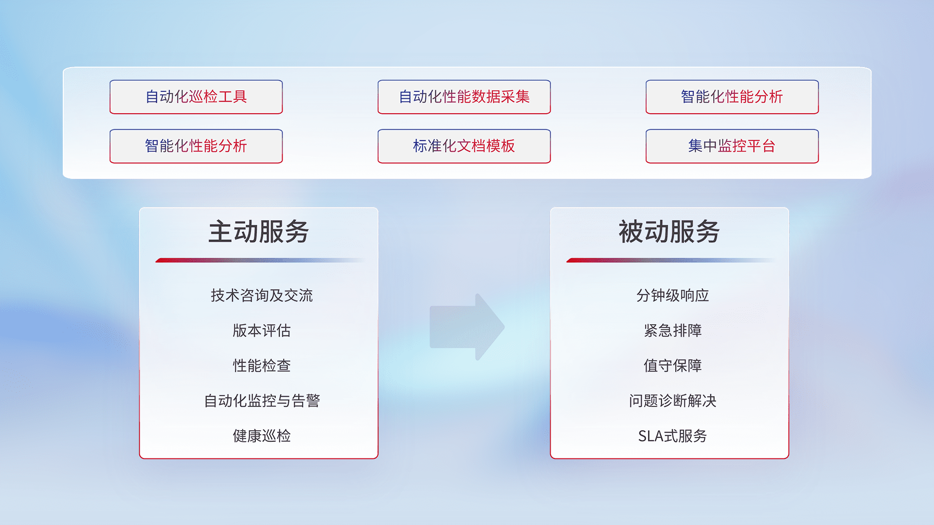 智能化工具和标准化文档,,保障服务质量,,,,提供主动服务(包含技术咨询、、、版本评估、、、、性能检查、、、自动化监控与告警、、、健康巡检)和被动服务包含(分钟级响应、、、、紧急排障、、、值守保障、、、问题诊断解决、、、SLA服务)。。